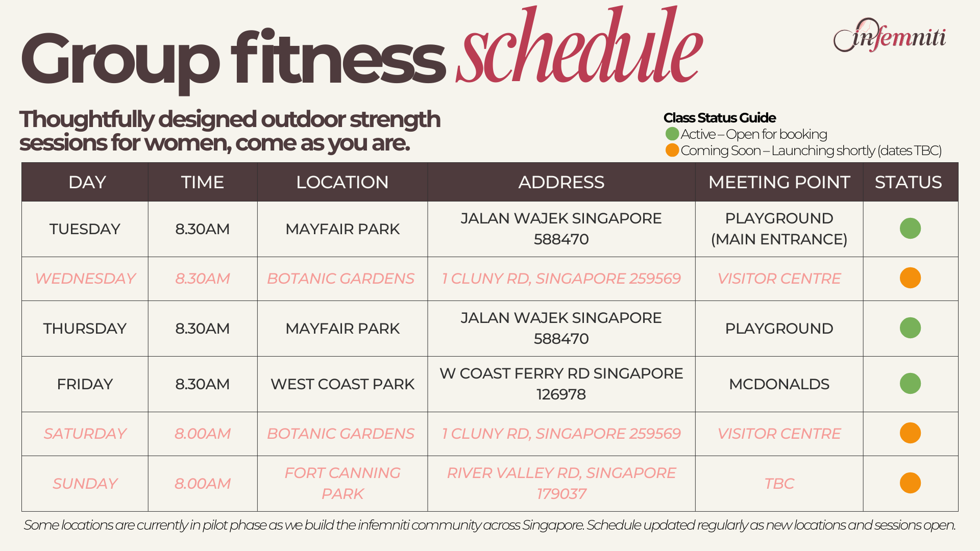 Strength that meets you where you are. infemniti Group Strength sessions are outdoor, coach-led workouts designed for women who want to feel stronger, more capable, and more connected, without pressure, comparison, or intimidation.